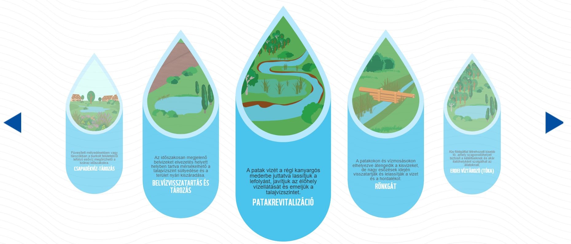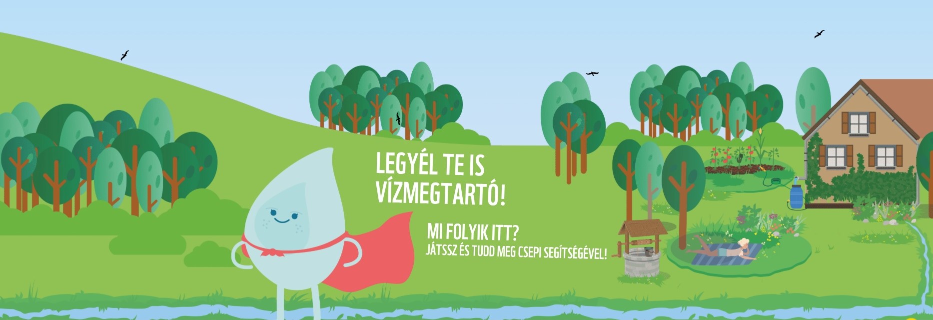 The central theme of the microsite is water—specifically water retention and the possibilities of keeping water locally, along with environmentally friendly, sustainable, and low-cost implementation methods. Visitors are guided through the site by a friendly character named Csepi. Csepi, the water drop character, accompanied the communication campaigns of the LIFE LOGOS 4 WATERS project, visually linking the wide range of topics covered by the project.